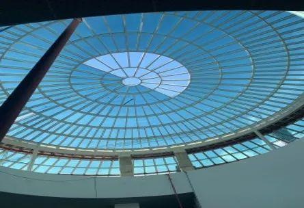 場館由珠江邊開始,在北部廣場兩側(cè)設(shè)置騎樓,利用一系列下沉庭院為地下空間提供了安全通道及怡人的景觀、通風(fēng)和采光,所有展廳都圍繞一個圓形中庭。絕美的外形設(shè)計(jì)也帶來了世界級極復(fù)雜的幕墻工程系統(tǒng),碲化鎘薄膜九宮格光伏發(fā)電組件組成的光電幕墻為世界首創(chuàng),立面四周及屋面全建筑光伏組件發(fā)電幕墻屬世界唯一,設(shè)計(jì)使用年限100年,整體幕墻面積7萬平方米。