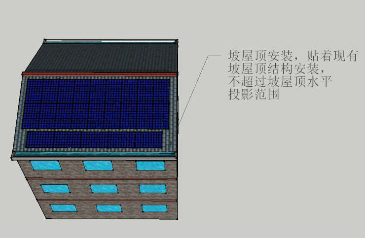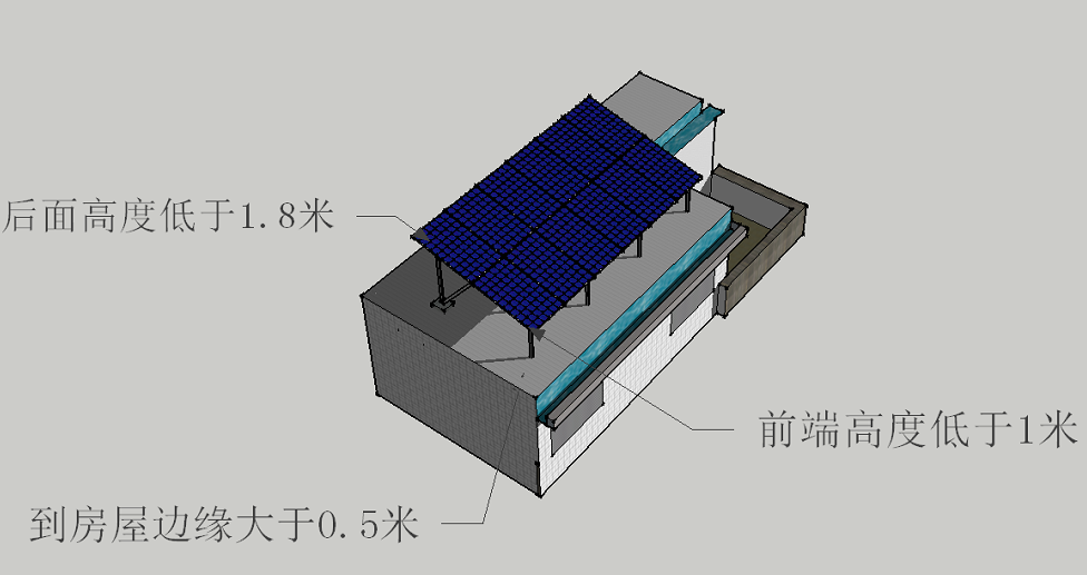 坡屋頂部分加裝太陽能光伏系統(tǒng),原則上貼現(xiàn)有坡屋頂結(jié)構(gòu)架設(shè)且不得超出屋頂范圍。平屋面加裝太陽能光伏系統(tǒng),直接架設(shè)在平屋頂上,且低端距屋面高度小于1.0米、高端距屋面高度小于1.8米、與平屋頂邊緣(女兒墻)距離大于0.5米。
