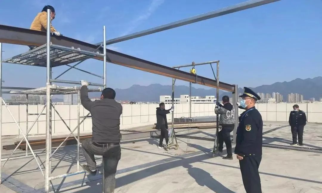 ? ? ? 原來該企業(yè)正在廠房樓頂建設(shè)光伏系統(tǒng),光伏支架已基本搭建完成,然而,該支架最高端高度近3米,最低端高度也有2.2米,明顯不符合光伏組建設(shè)置標(biāo)準(zhǔn)。執(zhí)法人員當(dāng)場責(zé)令該企業(yè)停止施工,并就“光伏建設(shè)相關(guān)要點指南”進行宣傳講解,指導(dǎo)企業(yè)主規(guī)范設(shè)置光伏系統(tǒng),并督促整改。因其逾期不整改,蘇溪大隊組織人員對光伏支架進行拆除。
